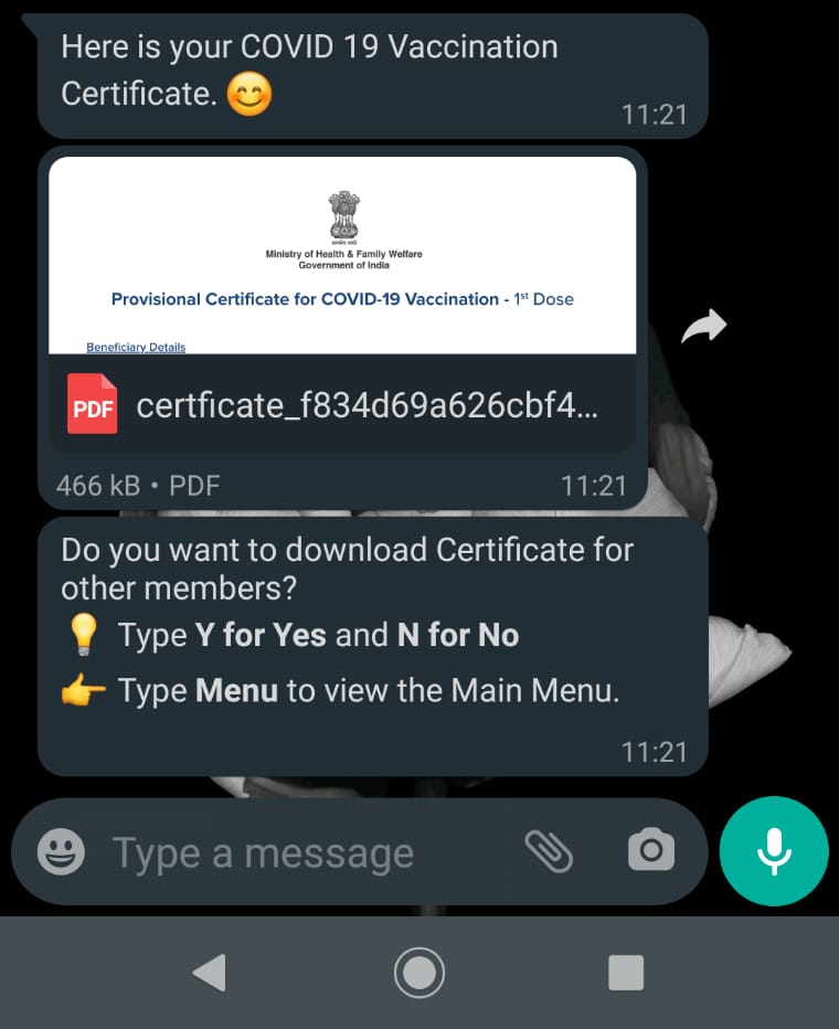 Также важно отметить, что вам необходимо получить хотя бы одну дозу вакцины против коронавируса, доступную в Индии, чтобы получить сертификат через бот WhatsApp.